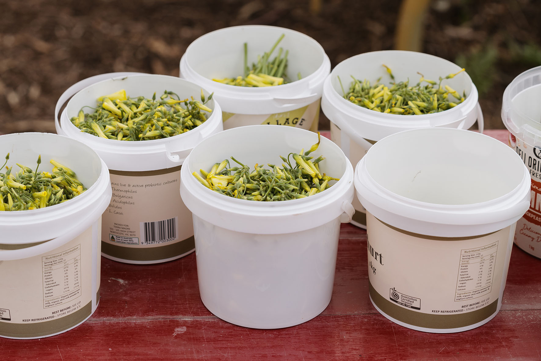 During this event, we walked together with a group to forage oxalis, a weedy plant with vivid yellow flowers and edible stems. The flowers were used to dye repurposed textiles over morning tea at CERES Community Garden.